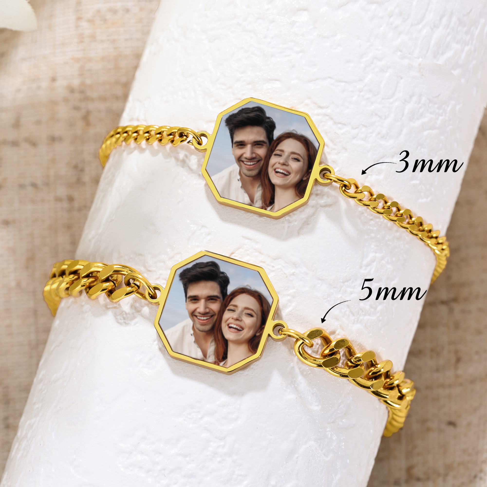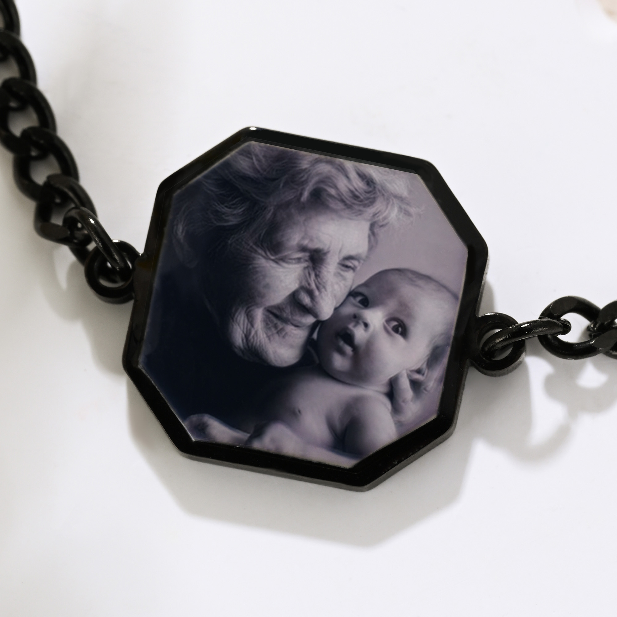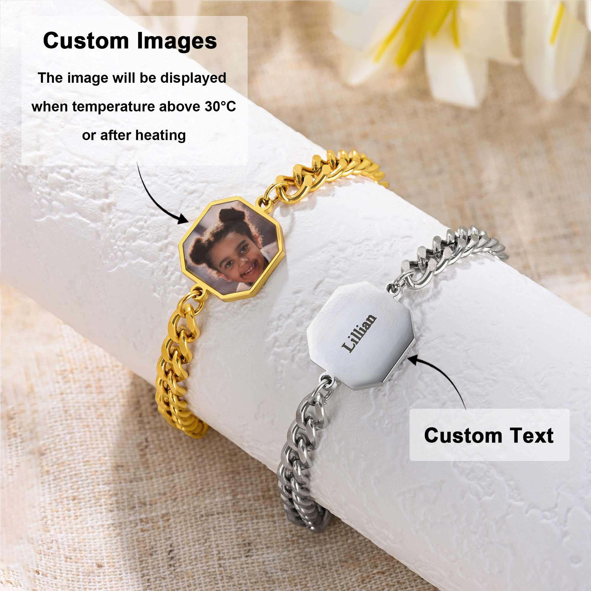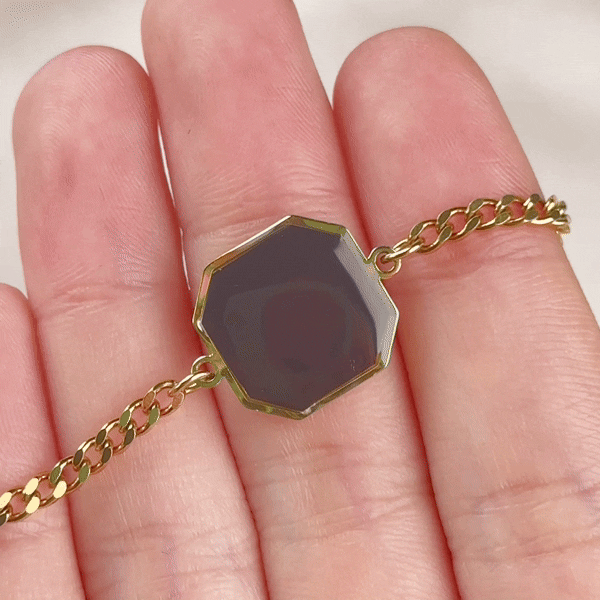 Secret Image Design - This octagon charm bracelet artfully combines thermal-reactive technology with personal customization. Its sleek chain silhouette feels refined and understated, while the heat-sensitive photo panel stays discreet until warmed by touch, slowly revealing a hidden image like a private moment brought to life. The back is finished with fine text engraving, adding another layer of individuality and detail.